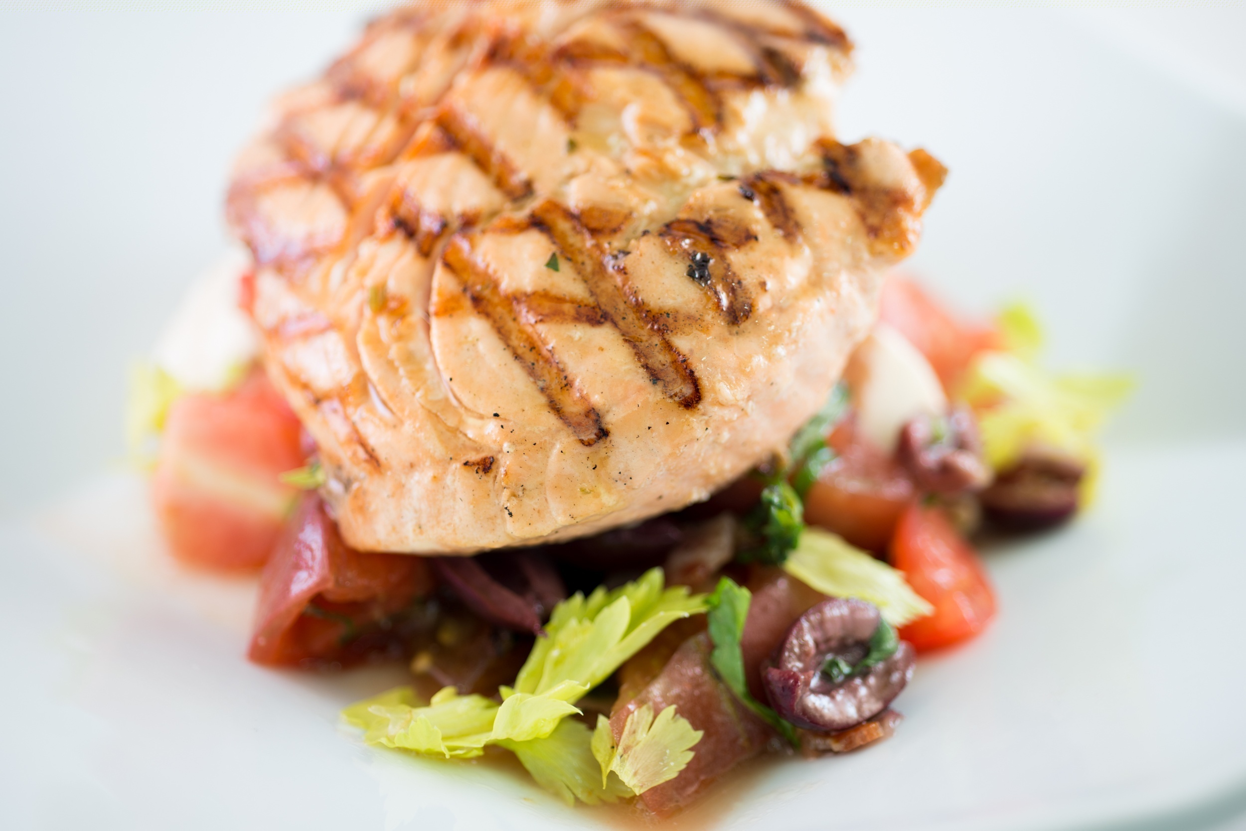 gourmet, healthy meal, barbecued grilled salmon, heirloom tomatoes, Kalamata olives, red wine vinaigrette, white plate, Mediterranean-inspired cuisine, vibrant, bold flavors, succulent richness, drizzle, complexity, symphony of flavors, culinary celebration, fine dining, food photography, delicious, balanced flavors, seafood, elegant presentation, upscale cuisine, fresh ingredients, health-conscious, nutritious, well-crafted, colorful, tantalizing