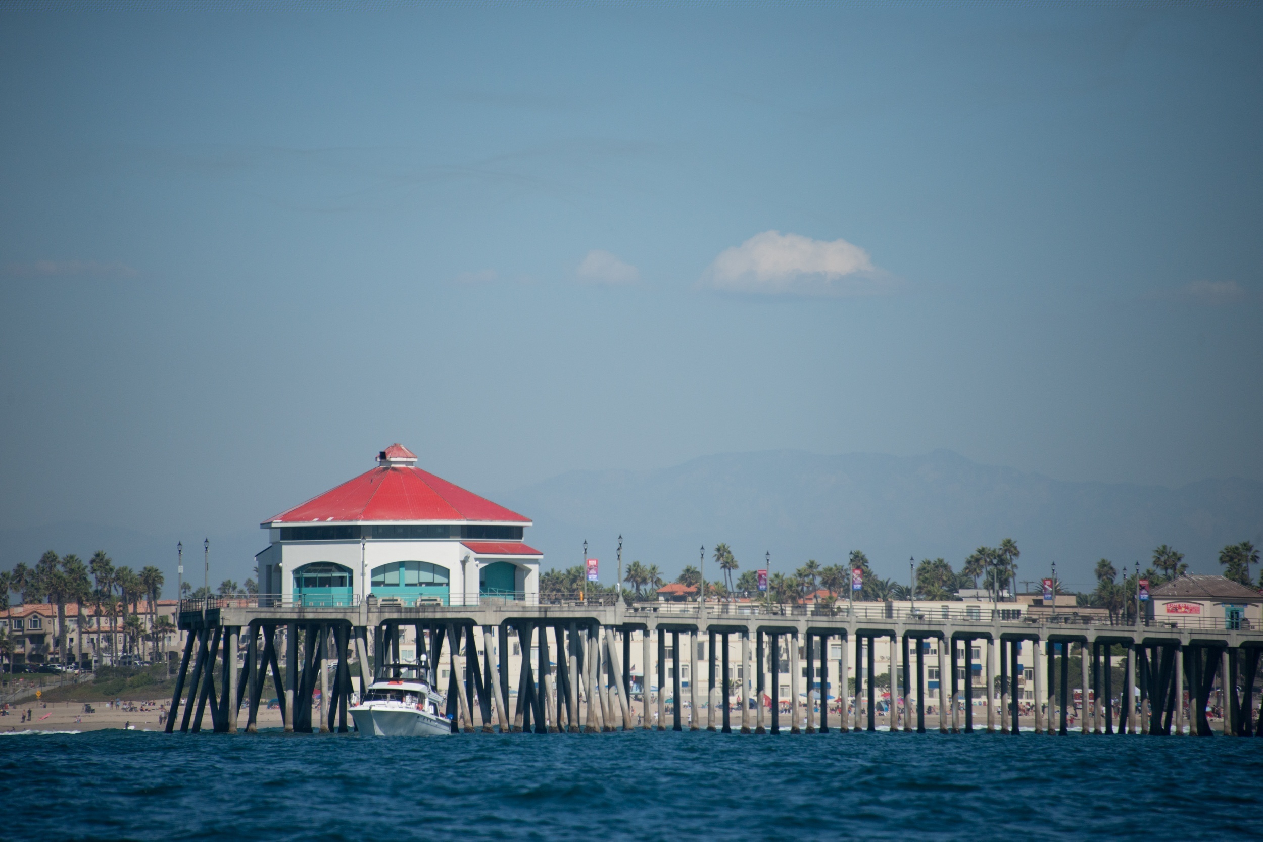 Huntington Beach, California, Huntington Beach Pier, ocean view, red roof, restaurant, local businesses, blue sky, clouds, San Gabriel mountains, haze, police patrol boat, air show, crowded beach, spectators, vibrant, atmosphere, seascape, coastal, tourism, Southern California, lifeguard, action, event, public gathering, safe waters, boats, golden sand, shoreline, mountain range, architecture