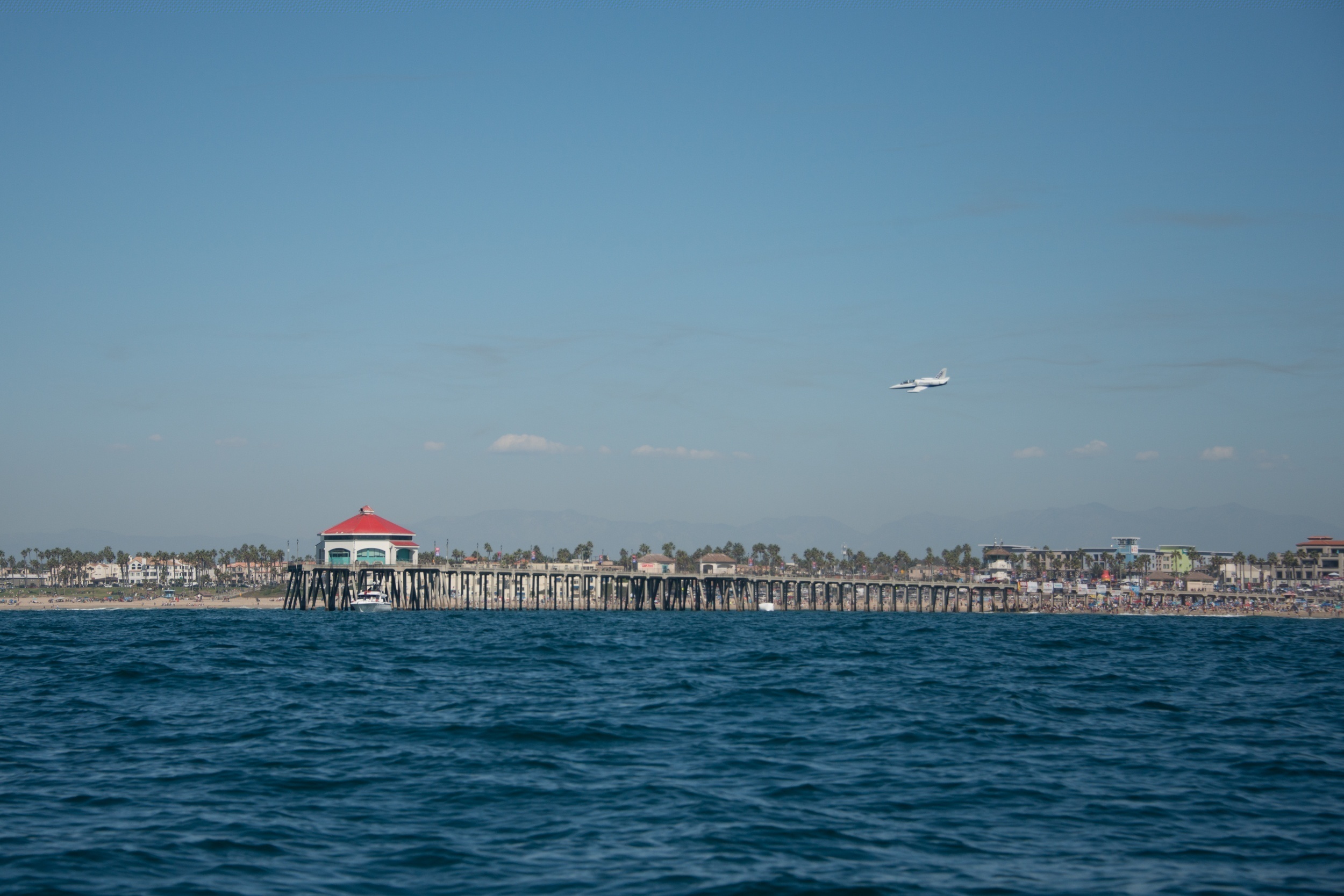 Huntington Beach, California, white jet, flying, spectators, Huntington Beach Pier, red-roofed restaurant, captivated crowd, police patrol boat, San Gabriel mountains, hazy backdrop, exhilaration, aerial prowess, ocean view, action, event, public gathering, Southern California, aviation, beach activity, dynamic, sunlight, golden sands, secure waters, entertainment, air show, fast-paced, high-flying, stunning, awe-inspiring