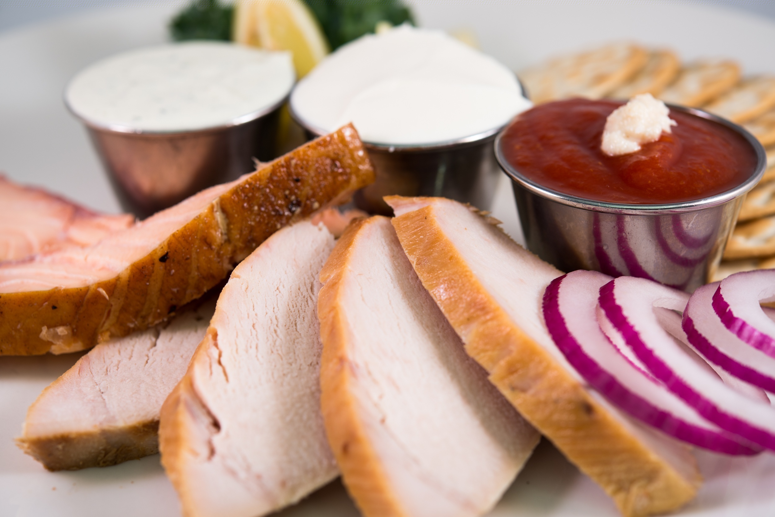 Delight in the ocean’s bounty with this sumptuous platter featuring smoked albacore and salmon, accompanied by sliced red onions. A trio of ramekins holds cocktail and tartar sauces, perfect for dipping. The setup is completed by a side of crackers, a garnish, and a lemon wedge for that extra zing. It’s not just a seafood spread; it’s an invitation to a gastronomic voyage.