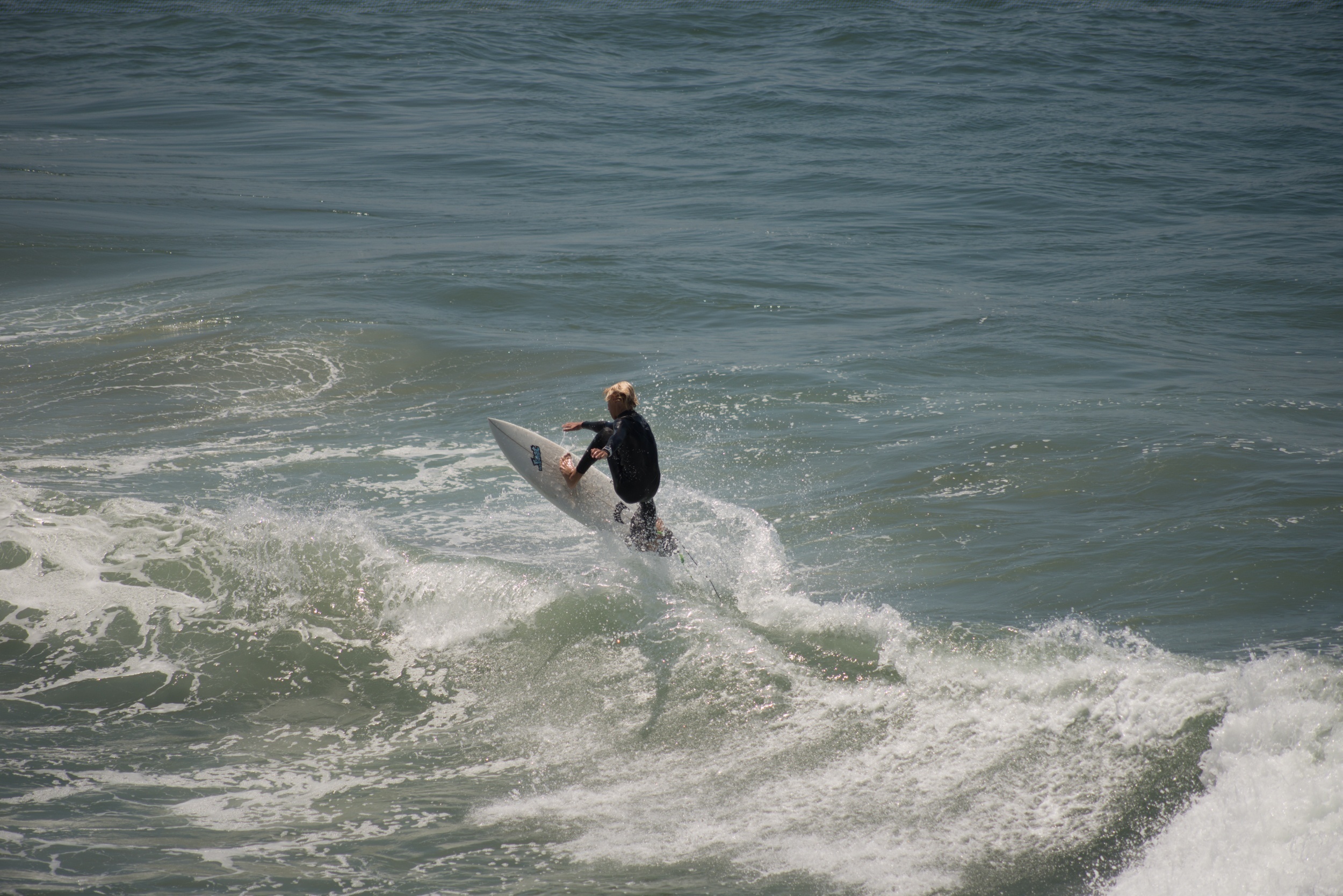 surfer, wetsuit, expertly turning, surf, dynamic, thrill, mastery, finesse, maneuver, power of the wave, skill, artistry, surfing, fleeting moment, balance, control, exhilaration, surfer and wave, Huntington Beach, Southern California, water sports, outdoor activity, adventure, adrenaline, athletic, oceanic, action shot, carving, sea, high-performance, agility, technique, male, blond, Californian